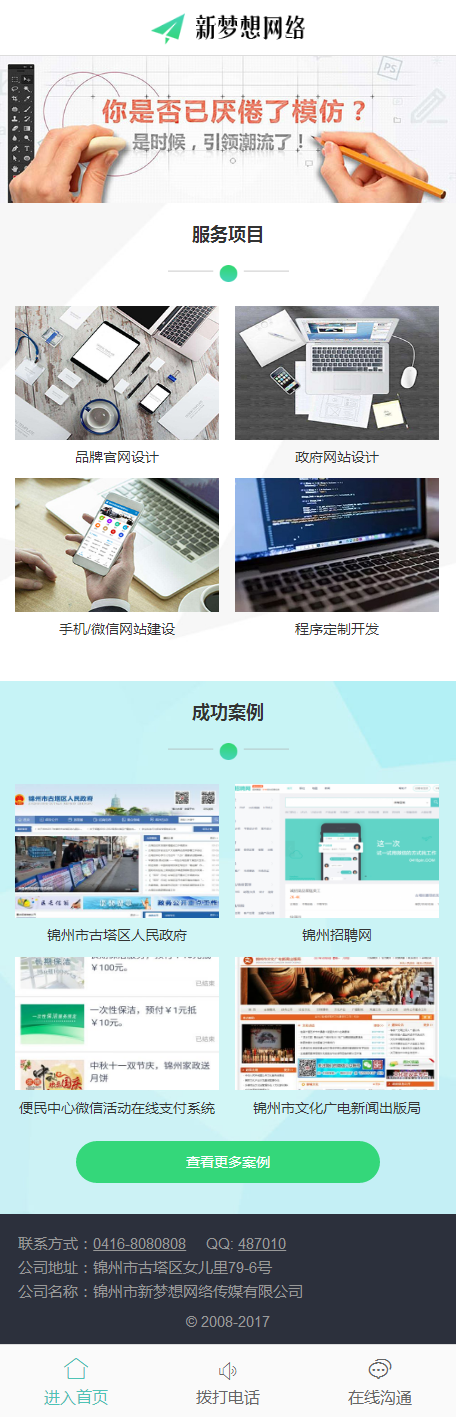 錦州市新夢(mèng)想網(wǎng)絡(luò)傳媒有限公司成立于2008年,是立足于錦州的專業(yè)互聯(lián)網(wǎng)服務(wù)提供商,也是覆蓋遼西五市的互聯(lián)網(wǎng)企業(yè)。致力于為事業(yè)單位、政府機(jī)關(guān)、企業(yè)提供網(wǎng)站建設(shè)、微信平臺(tái)搭建、軟件開發(fā)和企業(yè)大型商務(wù)活動(dòng)的策劃等服務(wù)。